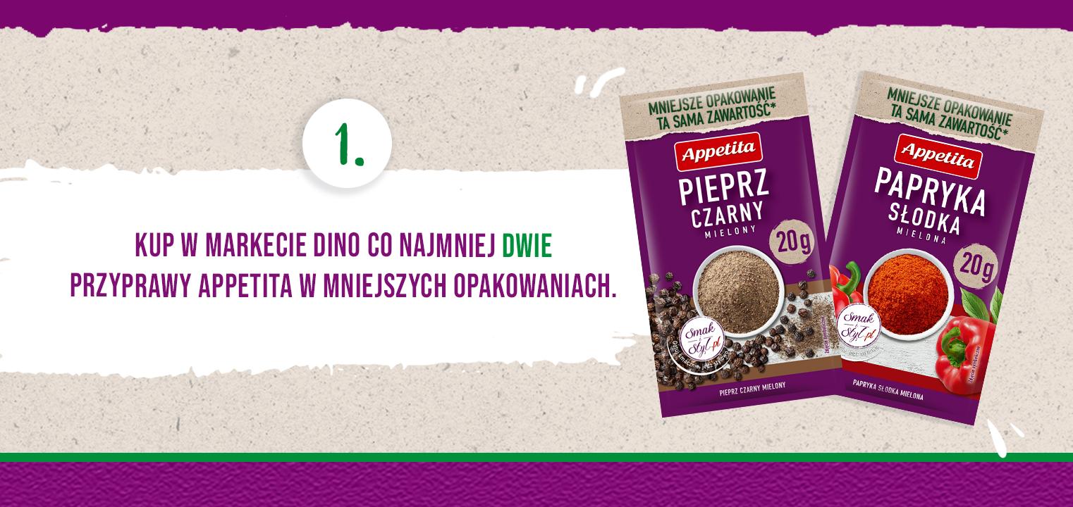 1.Kup w markecie Dino co najmniej dwie przyprawy Appetita w mniejszych opakowaniach.