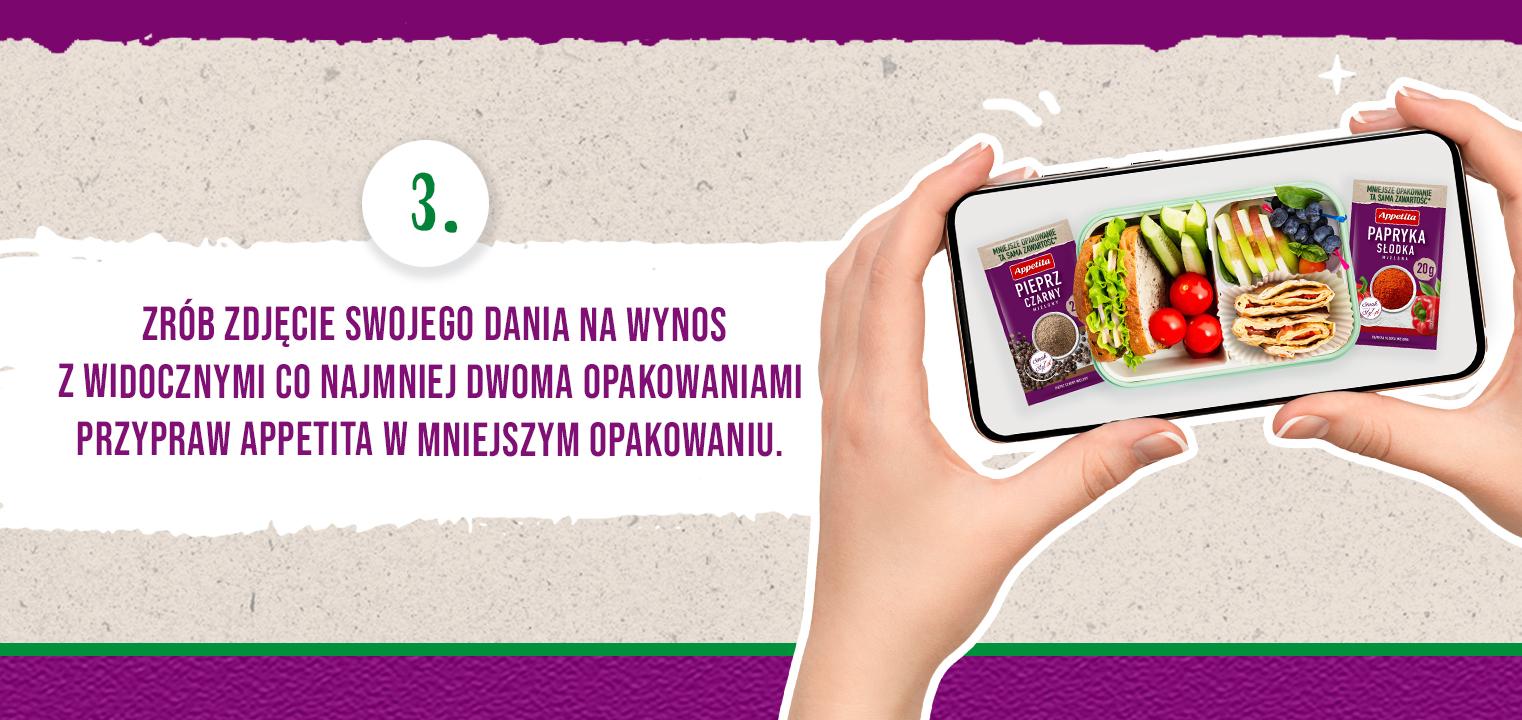 3. Zrób zdjęcie swojego dania na wynos z widocznymi co najmniej dwoma opakowaniami przypraw Appetita w mniejszym opakowaniu. Chcemy je zobaczyć na fotografii! Teraz dodaj to zdjęcie w komentarzu pod postem konkursowym.