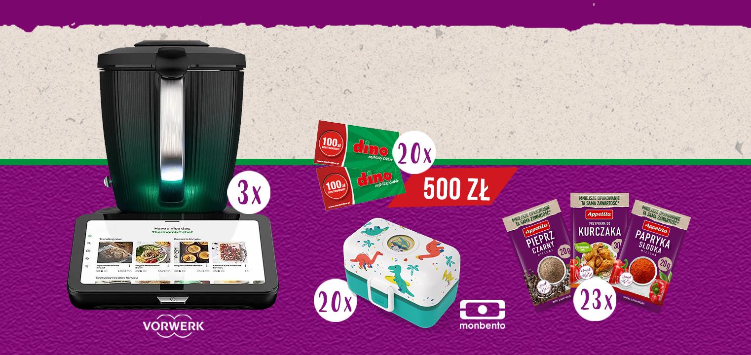 Nagrody pozwolą Ci eksperymentować w kuchni i dodawać smaku i koloru codziennym posiłkom – niezależnie, czy pakujesz posiłek dla siebie, dziecka czy dla całej rodziny. Efekt zachwytu w kuchni gwarantowany! Zdobywcy zwycięskiego miejsca, (których Organizator przewidział trzy) otrzymają najnowszy Thermomix™ 7 i zestaw przypraw Appetita. To jednak nie wszystko, bo nagrodzimy jeszcze 20 osób, które otrzymają bony do DINO o wartości 500 zł + lunchbox Monbento oraz zestaw przypraw Appetita.