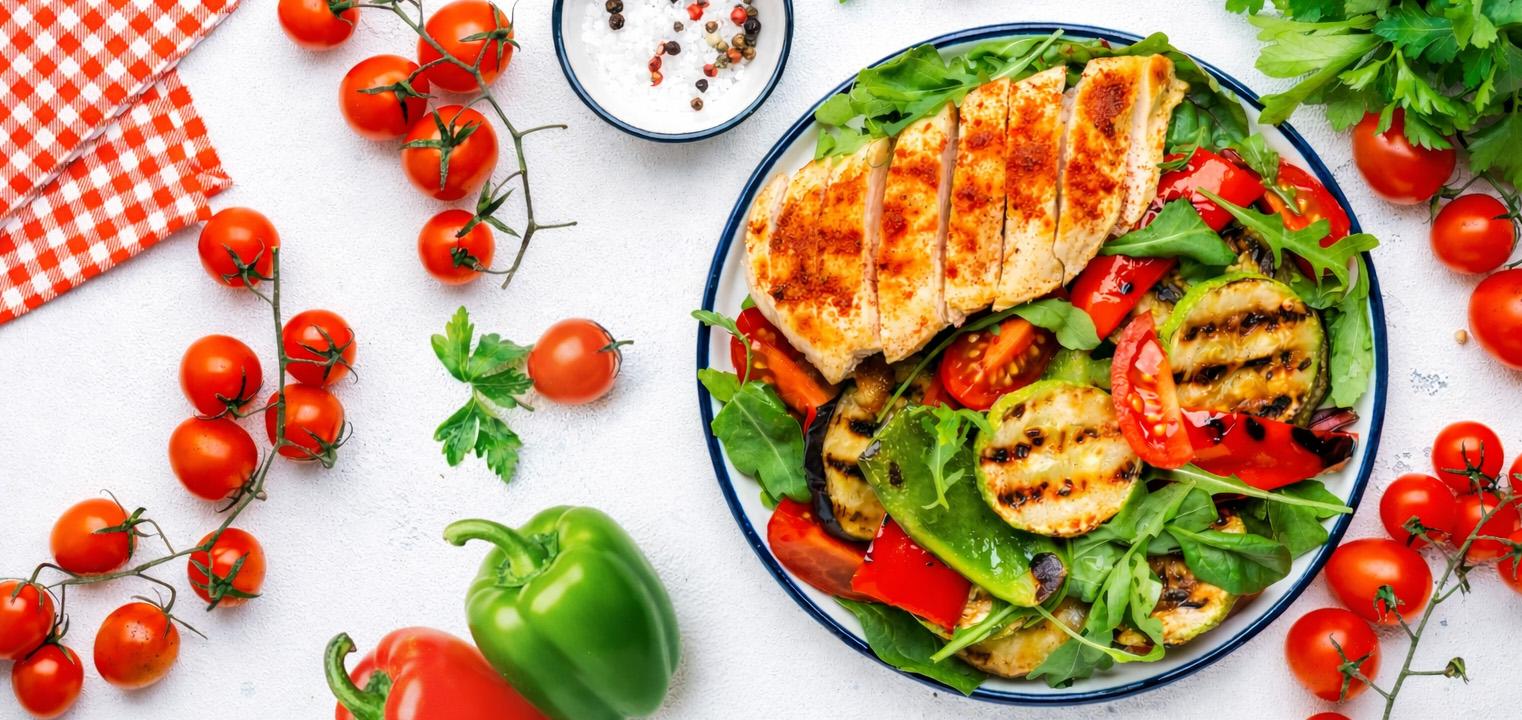 Pieczone warzywa z tymiankiem, grillowana pierś kurczaka z papryką wędzoną, sałatka z jogurtowym sosem czosnkowym – prosto, ale intensywnie.